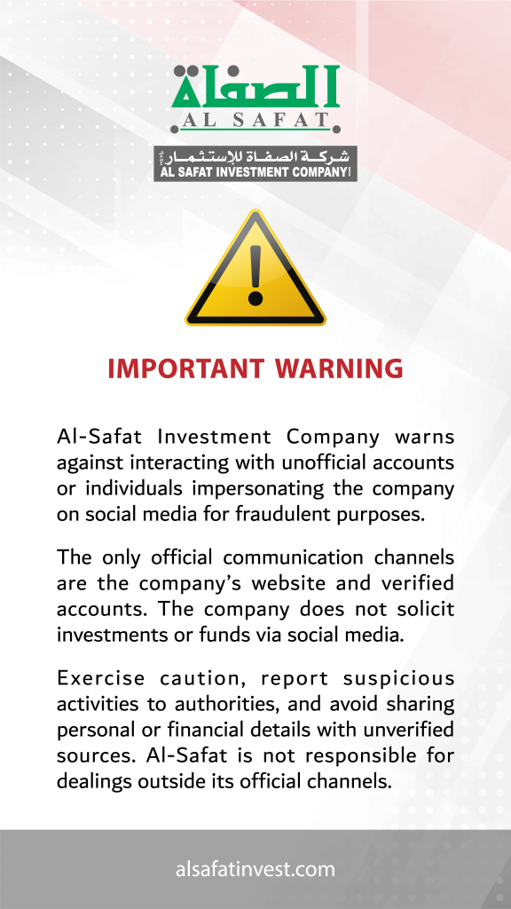 Al Safat Investment Co. KSCC, founded in Kuwait on September 15, 1983. It was transformed into a full-fledged investment-licensed company in 2003. Al Safat was relisted in October 2021 and kept growing its capital till it reached KD 28,327,569 in 2022. The main focus of the company is acquiring strategic investments in selective enterprises, industries and investment-vehicles seeking growth and capital appreciation all in accordance with the provisions of the Islamic Shari’a and in accordance with the Regulations and instructions of the Kuwait Capital Market Authority, Central Bank of Kuwait and Kuwait Ministry of Commerce and Industry..